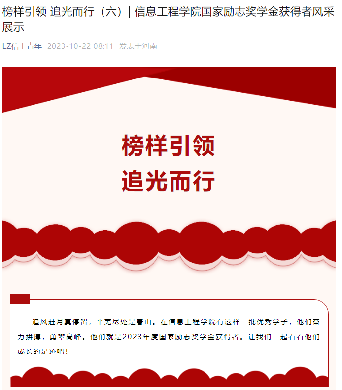 信息工程学院充分深入挖掘一批团员青年身边的青春故事,让广大学生学有榜样、行有标杆。充分利用微信公众号、微视频等线上宣传平台,打造身边的榜样“网红”,采用朋辈群体小组工作法,创新引领方式,实现与大学生的行为“互粉”、话语共频、情感共鸣。