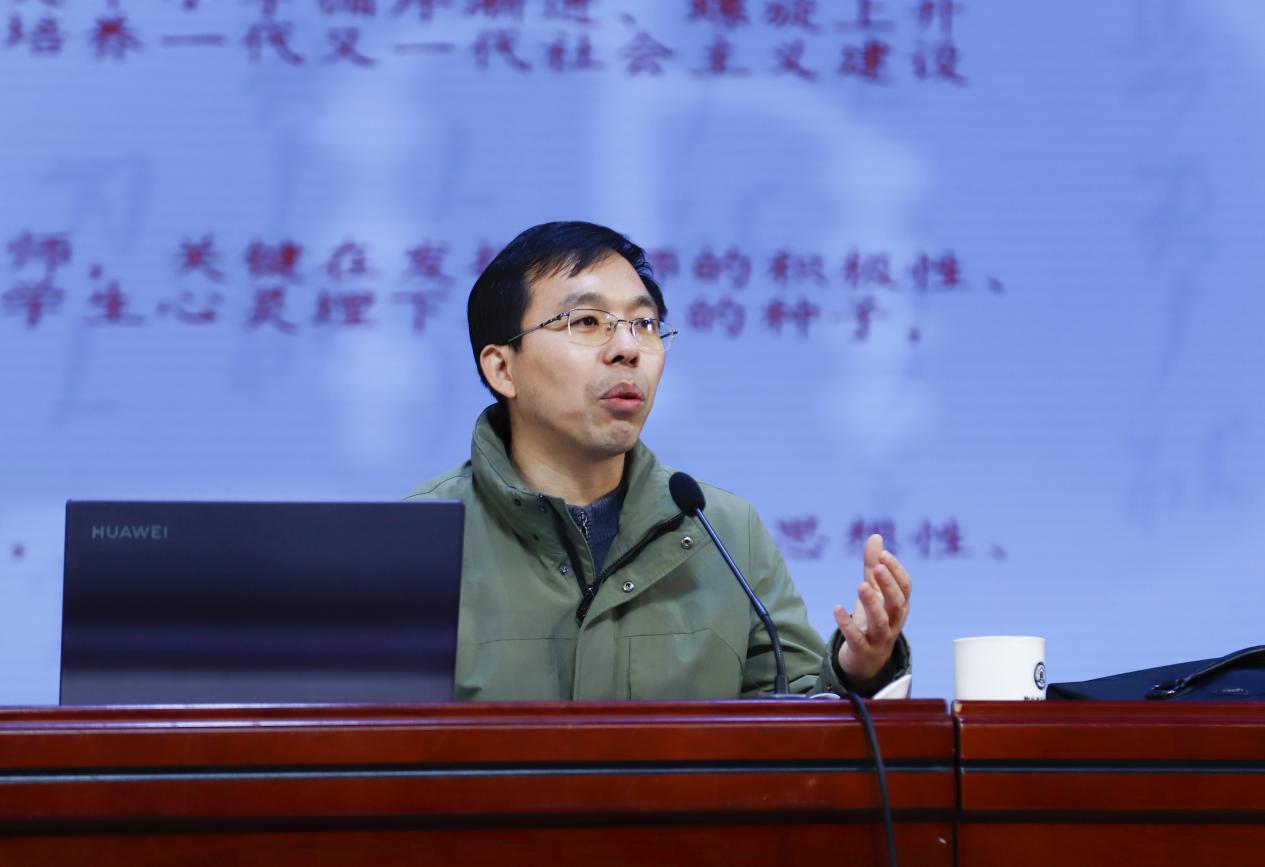 在下午进行的大中小学思政课一体化建设工作推进会上,洛阳师范学院马克思主义学院院长吴胜锋以《经典阅读与思想政治理论课教师专业素养提升》为题作专题讲座,张战杰就洛阳市大中小学思政课一体化建设工作开展情况作详细介绍。
