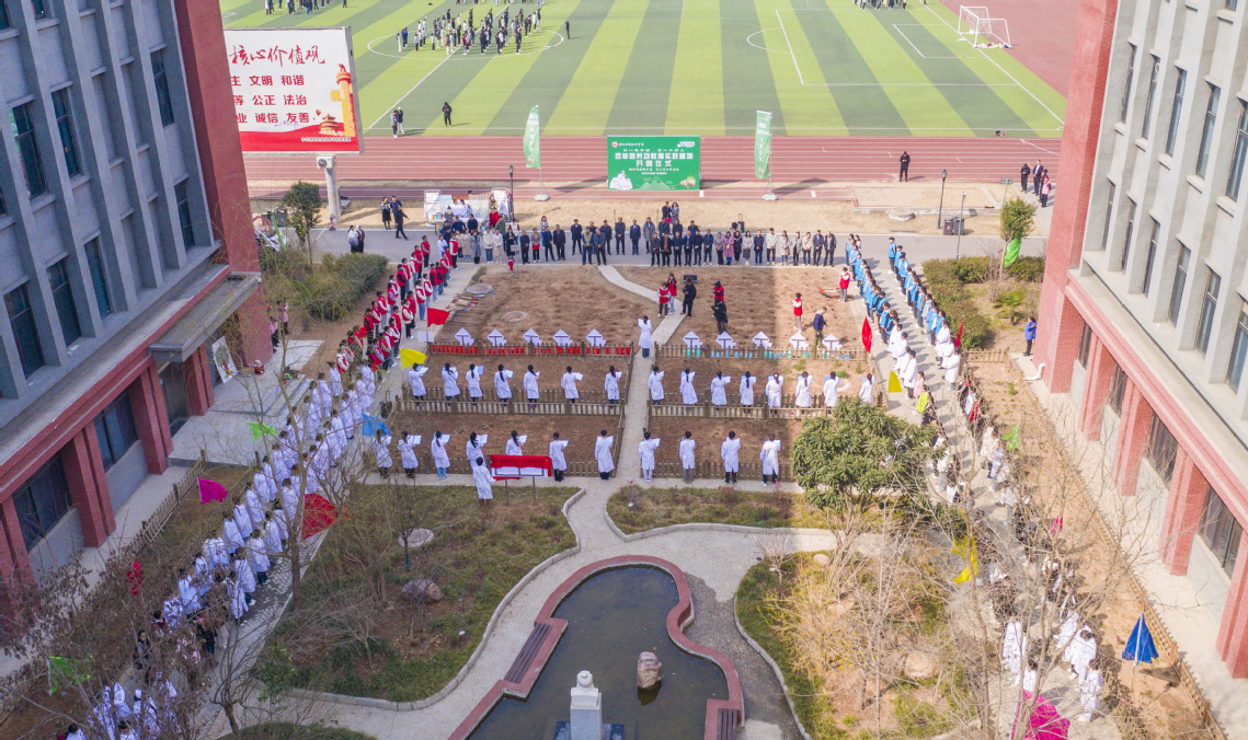开园仪式上,“百草园”学生社团学生集体集体诵读《素问·四气调神大论》节选传承中医文化,校领导和广大师生一起在百草园内种植杜仲、连翘、山茱萸等中草药植物300余棵。