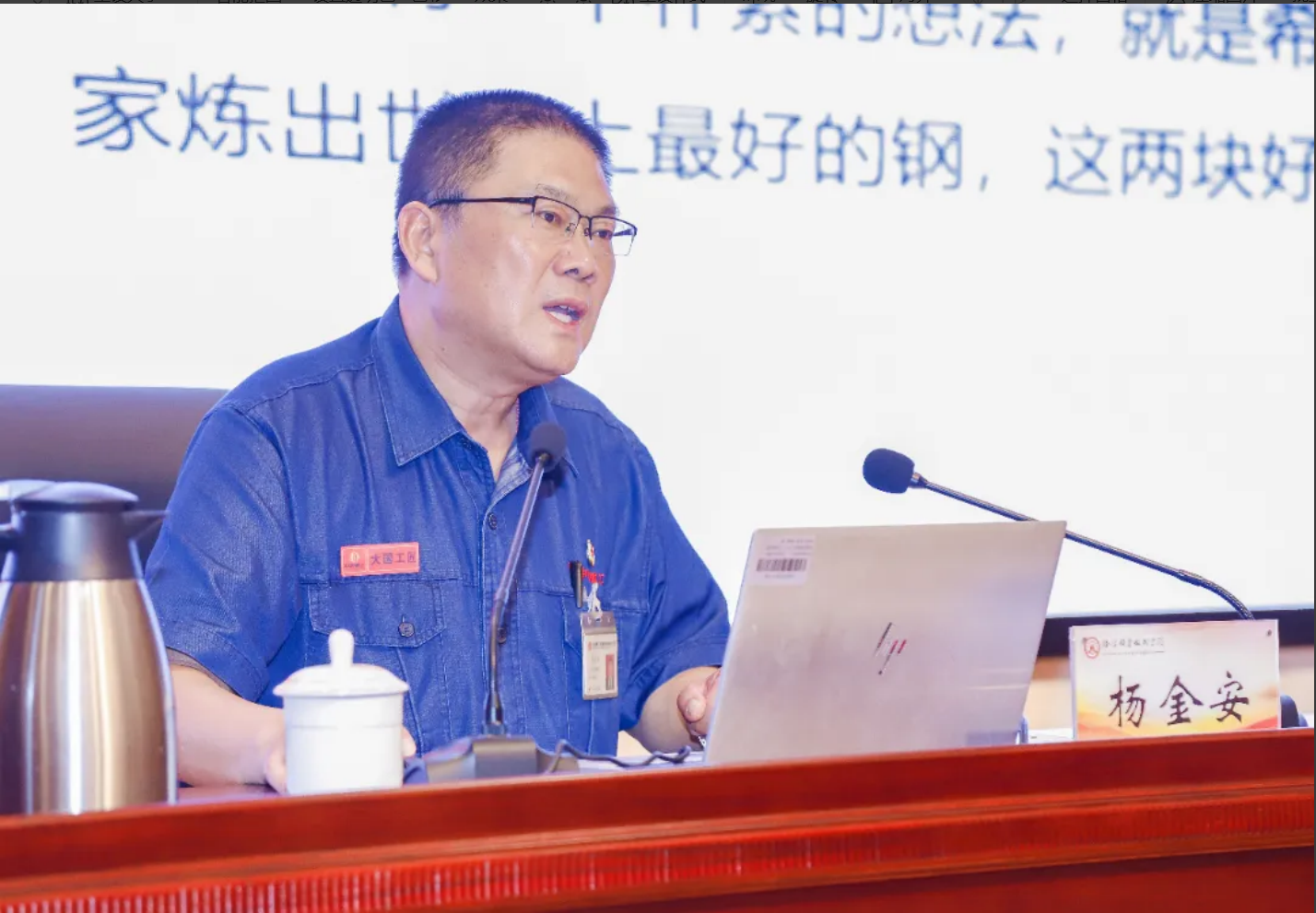 杨金安是河南省首位被评为大国工匠的炼钢工人,曾获“大国工匠2019年度人物”“全国五一劳动奖章”“全国技术能手”“中国工会十七大代表”等荣誉。他以“把两块好‘钢’献给国家 助力谱写制造强国新篇章”为题,详细讲述了自己从一名普通工人成为“大国工匠”的心路历程。